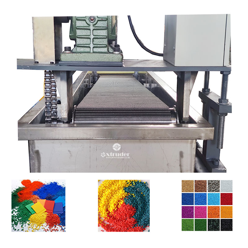 Water bath belt conveyor system Twin Screw Auxiliary Devices Uphill type belt convoyor half sink in water This device is for strands fast cold and strands surface case-hardened then go ahead to next step: air cooling belt convoyor for strands further cold. Sometimes, it used in EVA Titanium powder added Photovoltaic PV membrane granules extruder large output capacity plasitc extruder project.